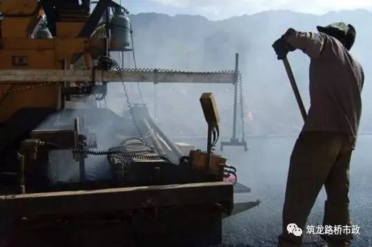 (2)橫向施工縫:全部采用平接縫。用三米直尺沿縱向位置,在攤鋪段端部的直尺呈懸臂狀,以攤鋪層與直尺脫離接觸處定出接縫位置,用鋸縫機割齊后鏟除;繼續攤鋪時,應將攤鋪層鋸切時留下的灰漿擦洗干凈,涂上少量粘層瀝青,攤鋪機熨平板從接縫處起步攤鋪;碾壓時用鋼輪壓路機進行橫向壓實,從先鋪路面上跨縫逐漸移向新鋪面層。